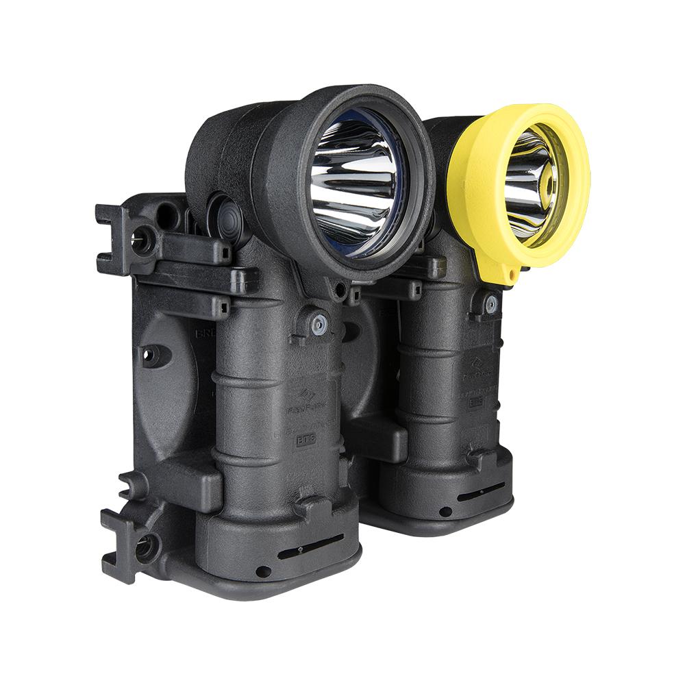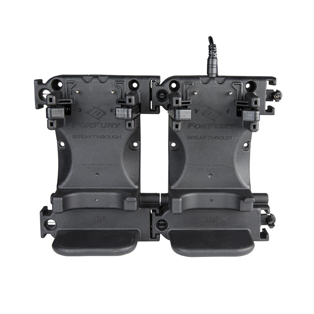 Rechargeable kit for FoxFury Breakthrough® BTS, BT2 and BT2+ right angle lights come with a docking station, rechargeable battery pack and charger. Multiple docking stations can be connected by snapping them together.