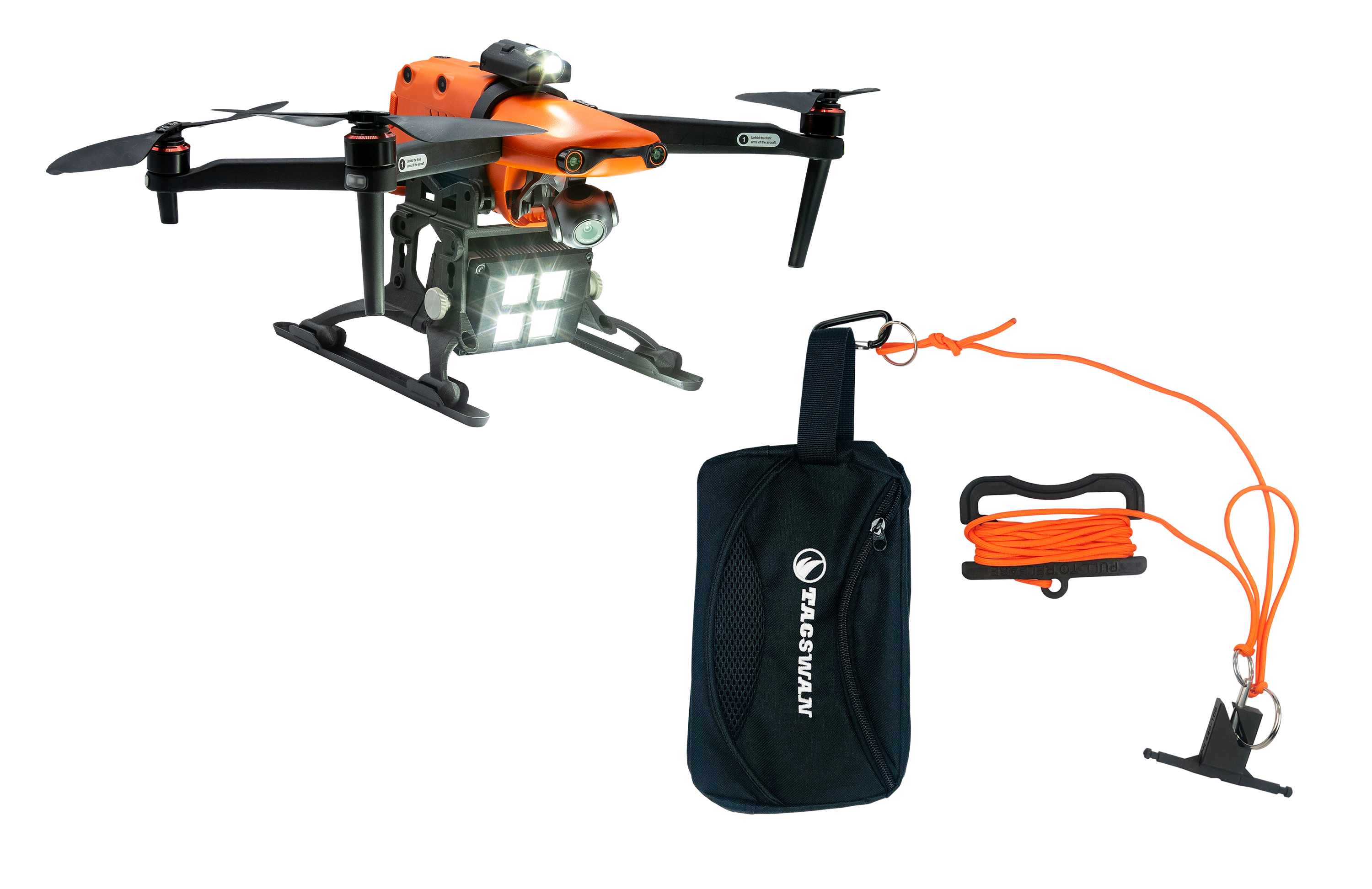 | Features | Will hold up to 25 lbs (11.34 kg) payload (drone dependent; EVO II and EVO III will carry 2.6 lbs/1.2 kg), Only requires 2-4 lbs (0.9 -1.8 kg) of force to release, Uses 550 Paracord, As an option, 400-500 ft. Paracord for beach rescue can be used |